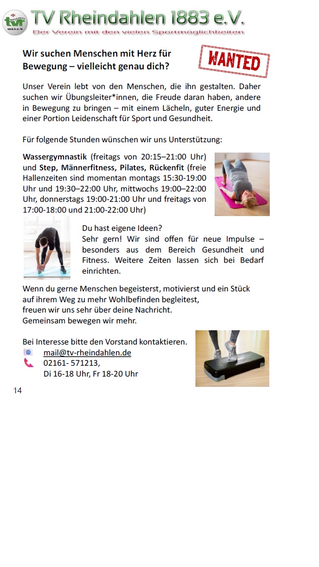 Interessenten/Interessentinnen melden sich bitte in unserer Geschäftsstelle unter 02161/16700 oder geschaeftsstelle@tv1848.com.
